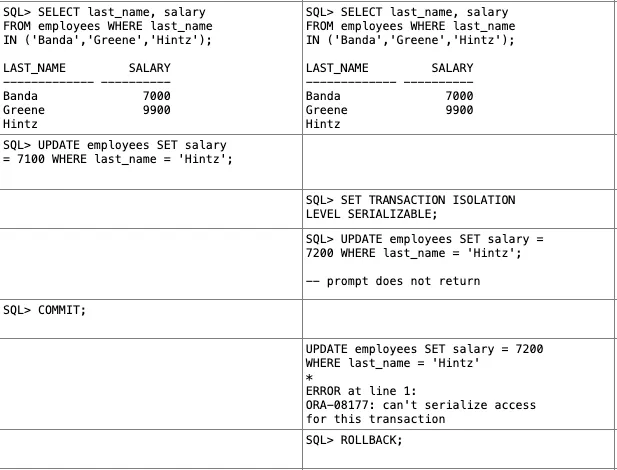Oracle Database permits a serializable transaction to modify a row only if changes to the row made by other transactions were already committed when the serializable transaction began. The database generates an error when a serializable transaction tries to update or delete data changed by a different transaction that committed after the serializable transaction began: