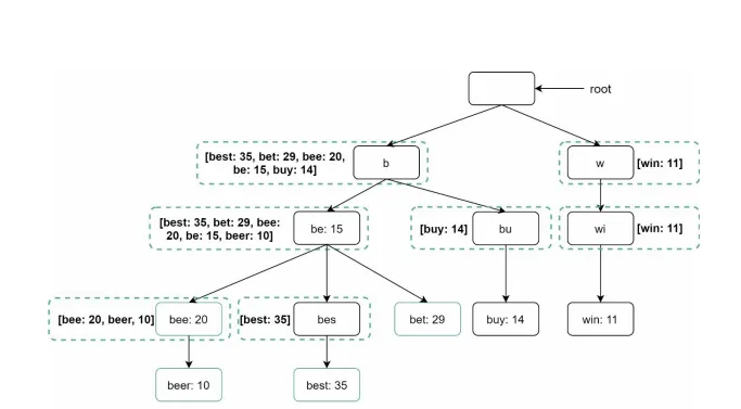 이 경우, 접두어를 최대 길이를 제한(O(p) → O(작은 상수값) ) 하거나 노드에 인기 검색어를 캐시하게 되면 시간 복잡도가 O(1) 가 바뀔 수 있게 됨. 즉 각 노드는 자식 노드 외에 해당 접두어에 대한 Top-K 정보를 저장하여 전체 트리를 탐색하지 않고도 빠르게 결과를 반환할 수 있도록 함