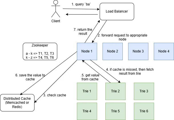 Zookeeper 는 Trie 샤드의 메타데이터 관리 및 조정의 역할을 수행함(=shard map manager). 접두어 범위를 나누고 어떤 노드가 어떤 범위를 담당하는지 기록. 각 노드는 prefix 기반으로 어떤 샤드에 요청해야 하는 지를 판단할 수 있음 (=service discovery 역할)